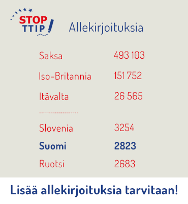 Itseorganisoitu kansalaisaloite TTIP:n ja CETA:n pysäyttämiseksi on kerännyt jo yli 750 000 allekirjoitusta 28:ssa EU-maassa! Suomi on jo Ruotsia edellä allekirjoitusten määrässä, mutta lisää nimiä tarvitaan.